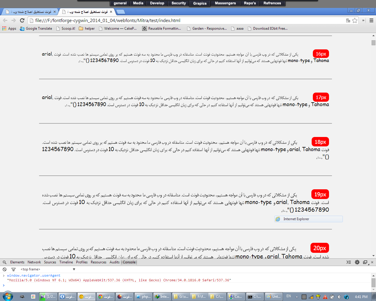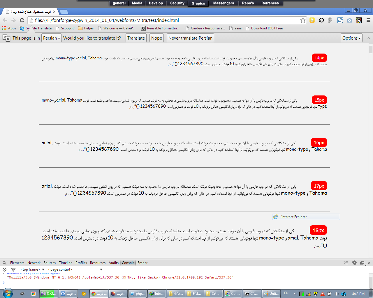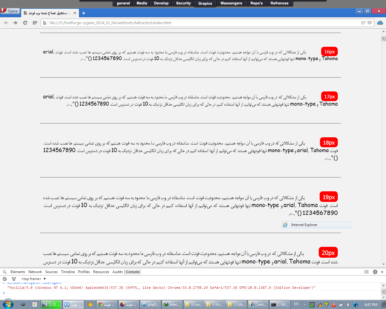این تعداد فونت در ۹۹٪ از مرورگر ها و در تمام سیستم عامل ها به خوبی رندر شدند و فقط در مرورگر کروم ویندوز به دلیل عدم پشتیبانی این مرورگر از یک قابلیت در ویندوز، فونت ها رو به صورت ناخوشایندی رندر می‌کرد.